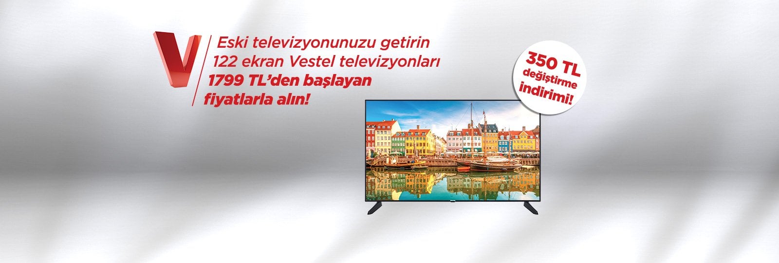 Vestel dev televizyon değişim kampanyasıyla dev genişliği salonunuza getiriyor. Markası ne olursa olsun eski televizyonunuzu alalım, Yepyeni 122 ekran Vestelleri 1799 TL’den başlayan fiyatlarla evinize teslim edelim! Türkiye gelişiyor, televizyonlar değişiyor.